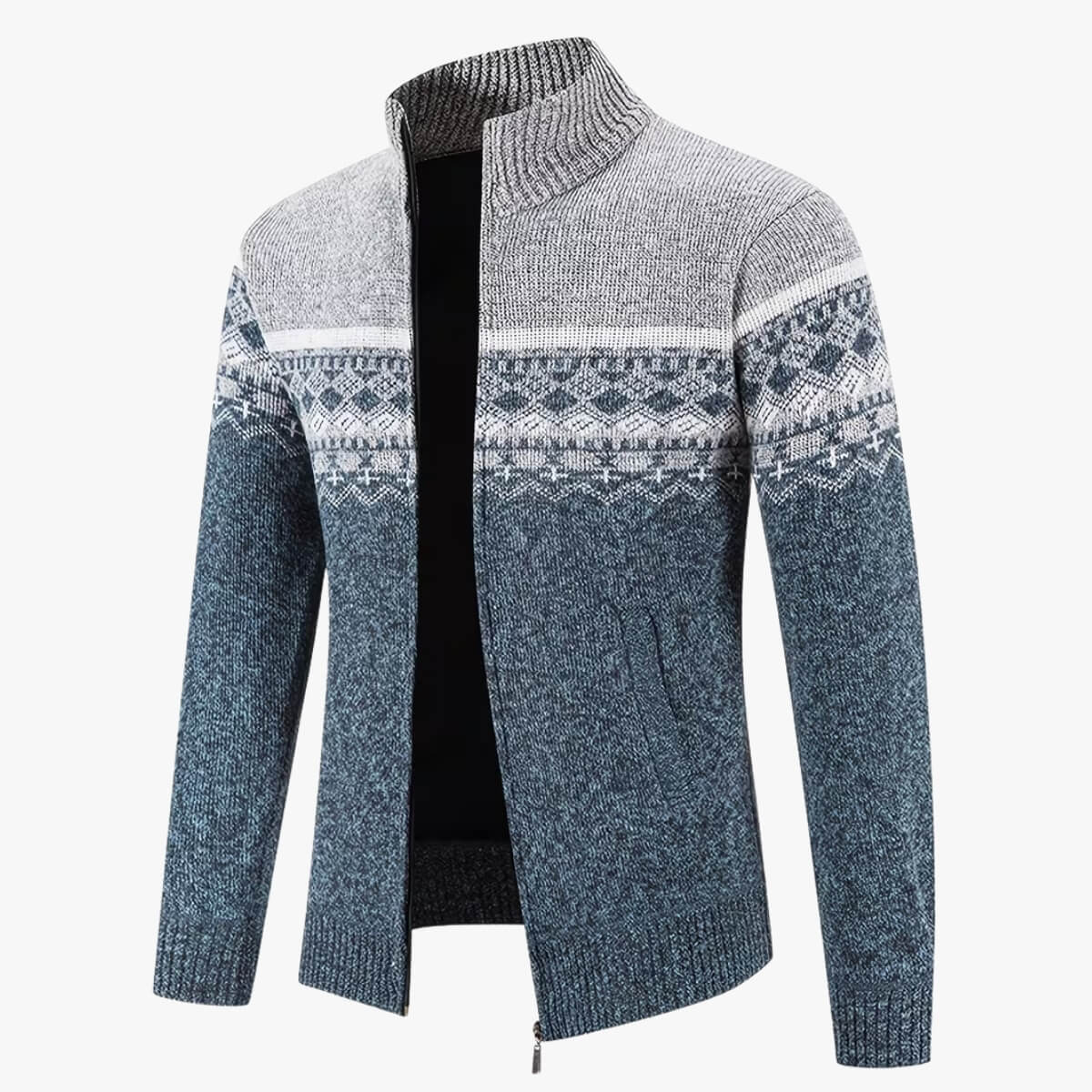 This zip-up cardigan features a classic Fair Isle pattern across the chest and arms, blending traditional design with a modern silhouette. The heavy-gauge knit provides a substantial feel and natural warmth, making it a reliable choice for cooler days. It is finished with a ribbed mock neck and side pockets, offering a clean, structured look that pairs easily with chinos or denim.